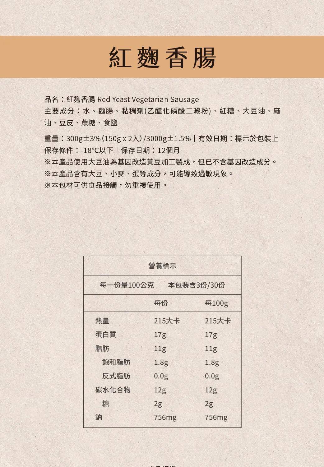 ■ 素紅麴香腸融合傳統製腸工藝與植物食材創新,加入天然紅麴、紅糟、醬油、糖及香辛料調味,經過拌合、灌製、蒸熟等步驟製成,色澤紅潤、香氣撲鼻。每口皆有紅麴獨特甘香與台式鹹香氣息,是傳統香腸的素食版演繹。